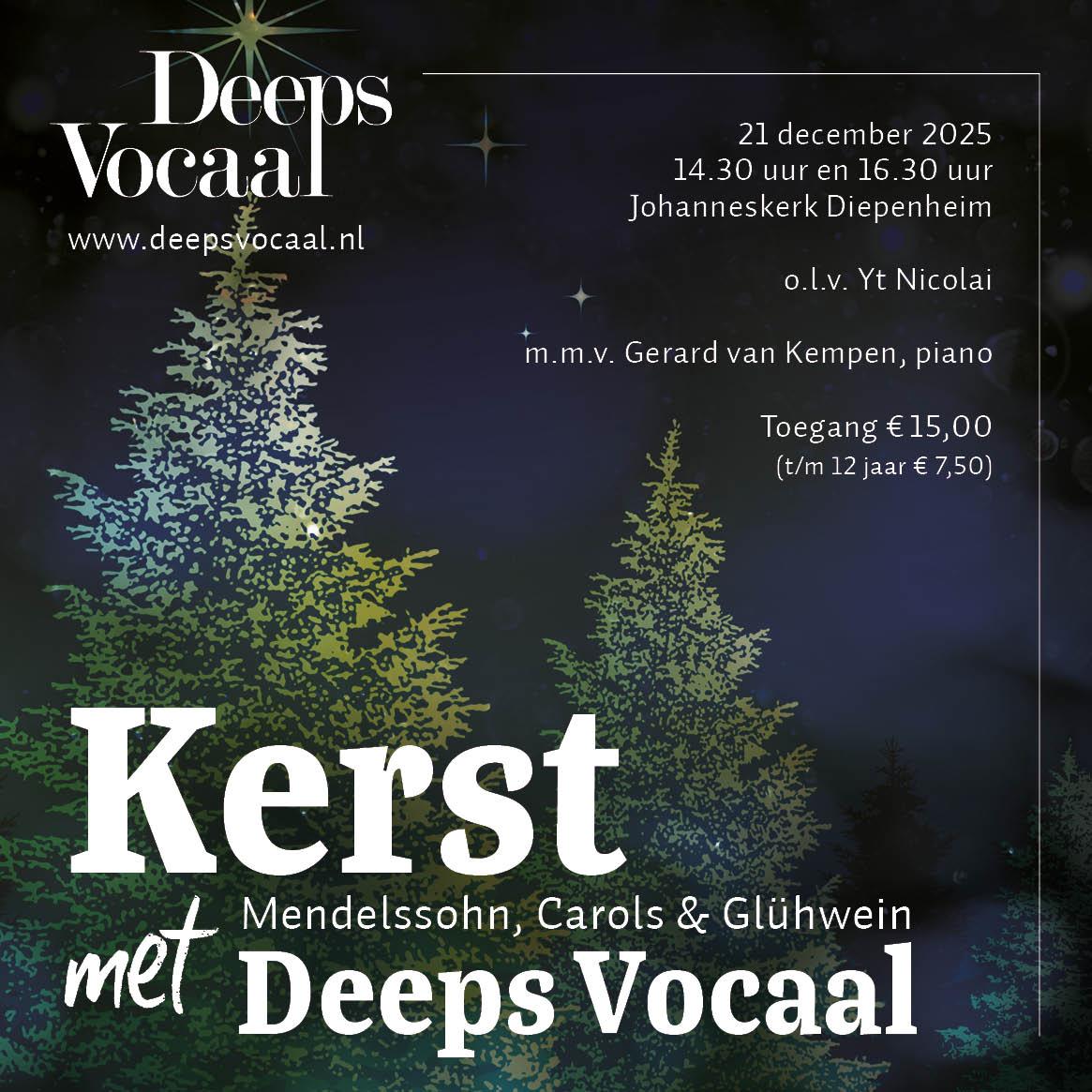 Op zondag 21 december 2025 bracht Deeps Vocaal twee kerstconcerten op één middag. Met sfeervolle kerstliederen, een dubbelkwartet van Tallis en Psalm 42 van Mendelssohn. Het koor werd bij deze sfeervolle kerstconcerten begeleid door Gerard van Kempen op de piano.